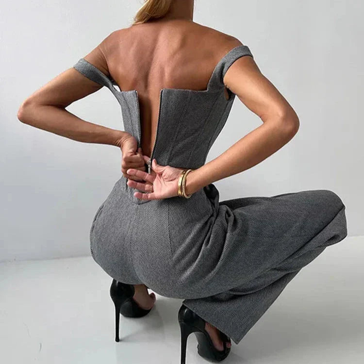 A tailored blazer, sculpted corset, and high-waist wide-leg trousers combine modern elegance with timeless class. Perfect for commanding attention in the boardroom or turning heads at dinner, this set redefines power dressing.